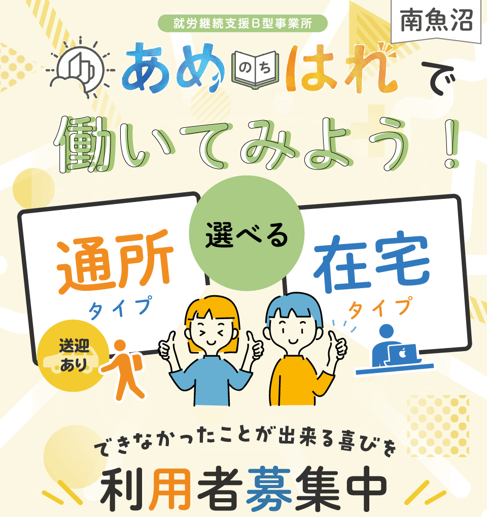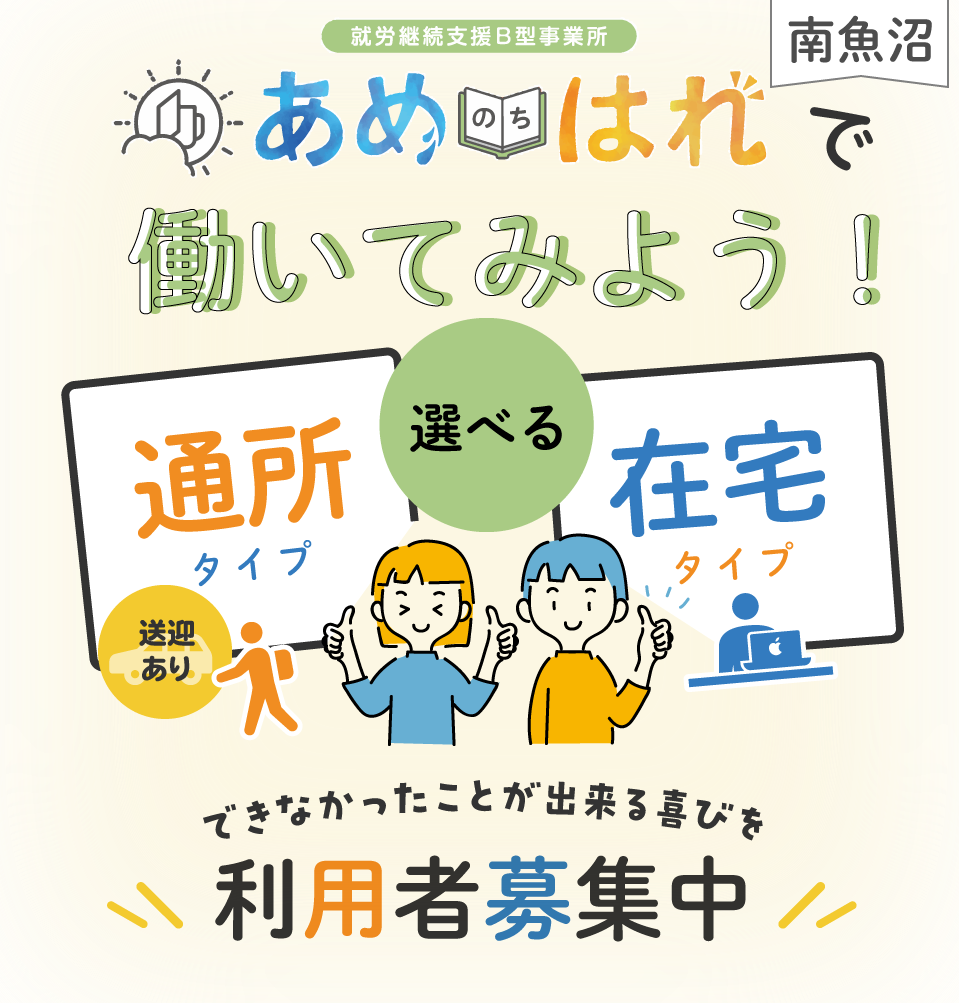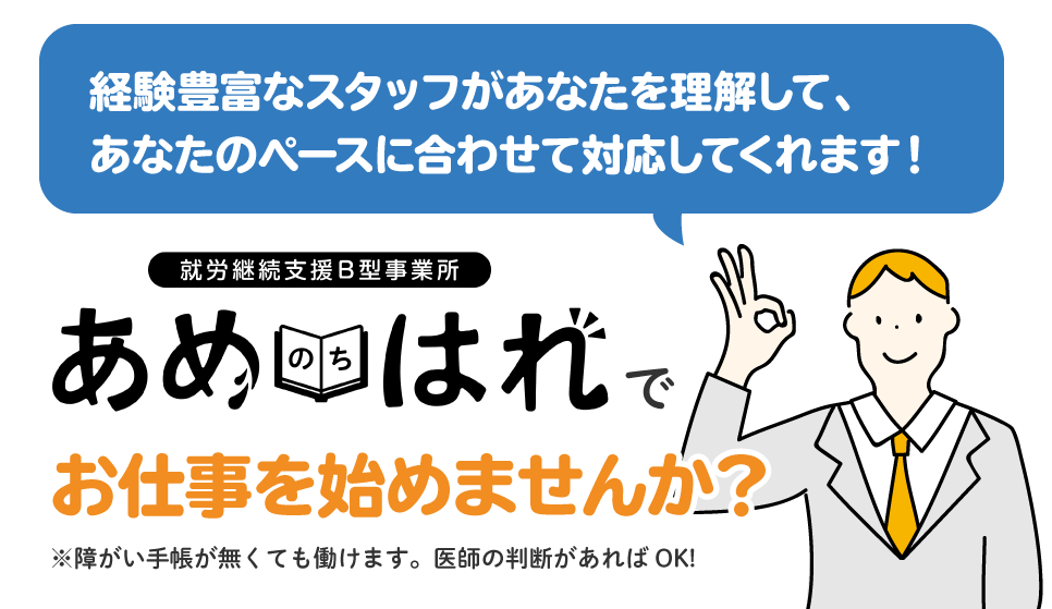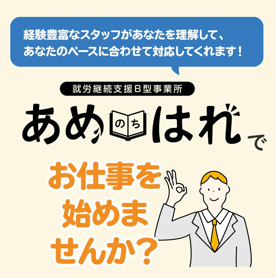 「あめのちはれ」で働いてみたい、家族や知り合いに紹介したい、説明だけ聞いてみたい、などお気軽にご相談ください♪お返事に数日要する場合がございます。お急ぎの場合はお電話でお願いいたします。
